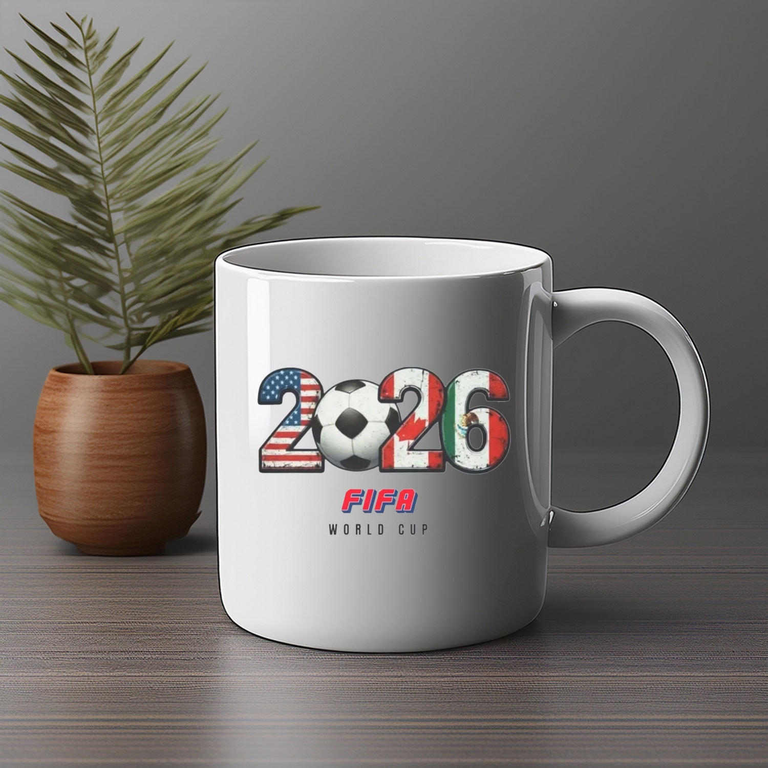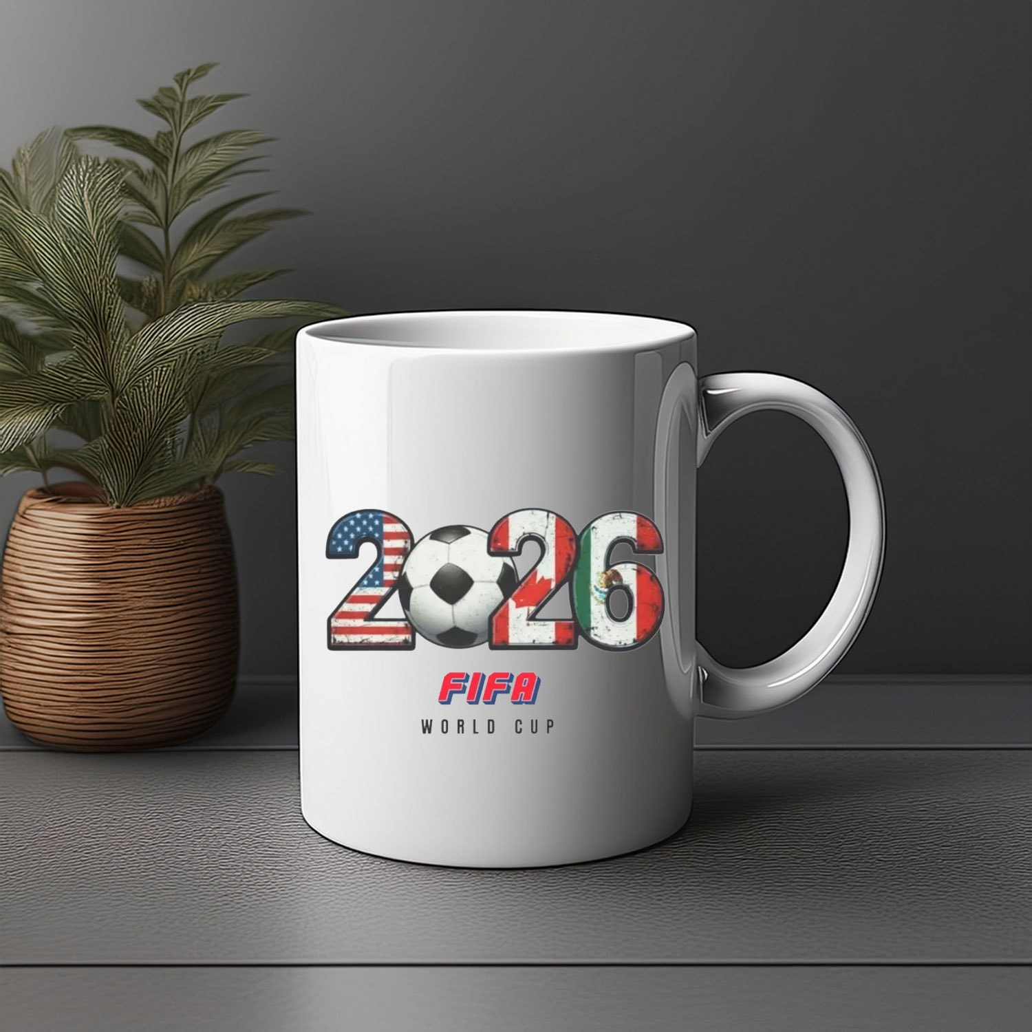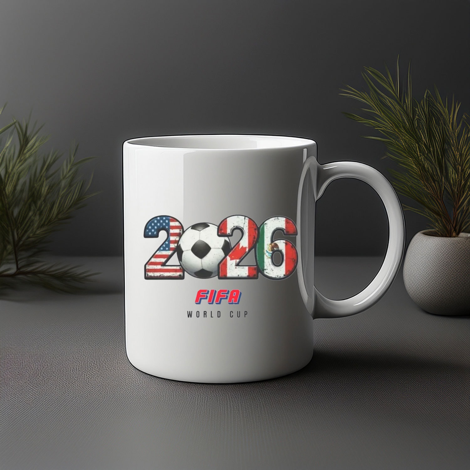 This mug showcases a modern and creative layout using flags to form the numbers 2-0-2-6, symbolizing the year of the historic tri-nation World Cup. Key design elements may include: