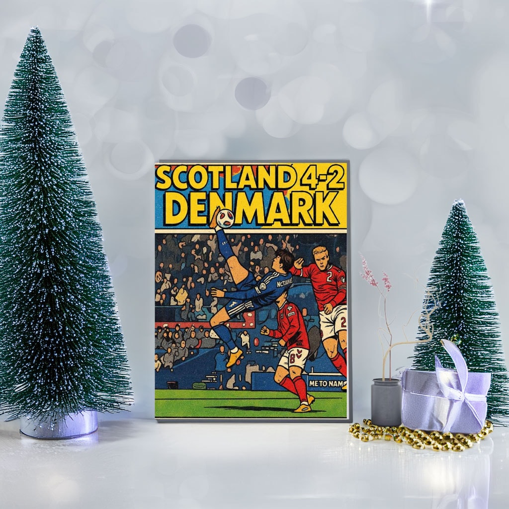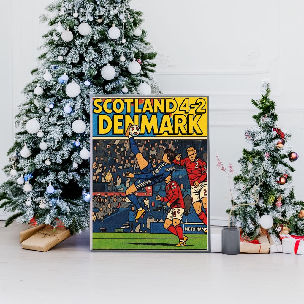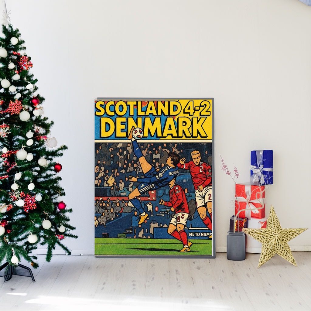 Bring home the pride, passion, and unforgettable excitement of the Scotland 4–2 Denmark Football Art Print Poster — a powerful celebration of Scottish football history.