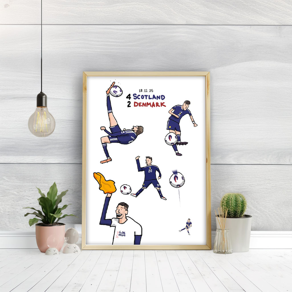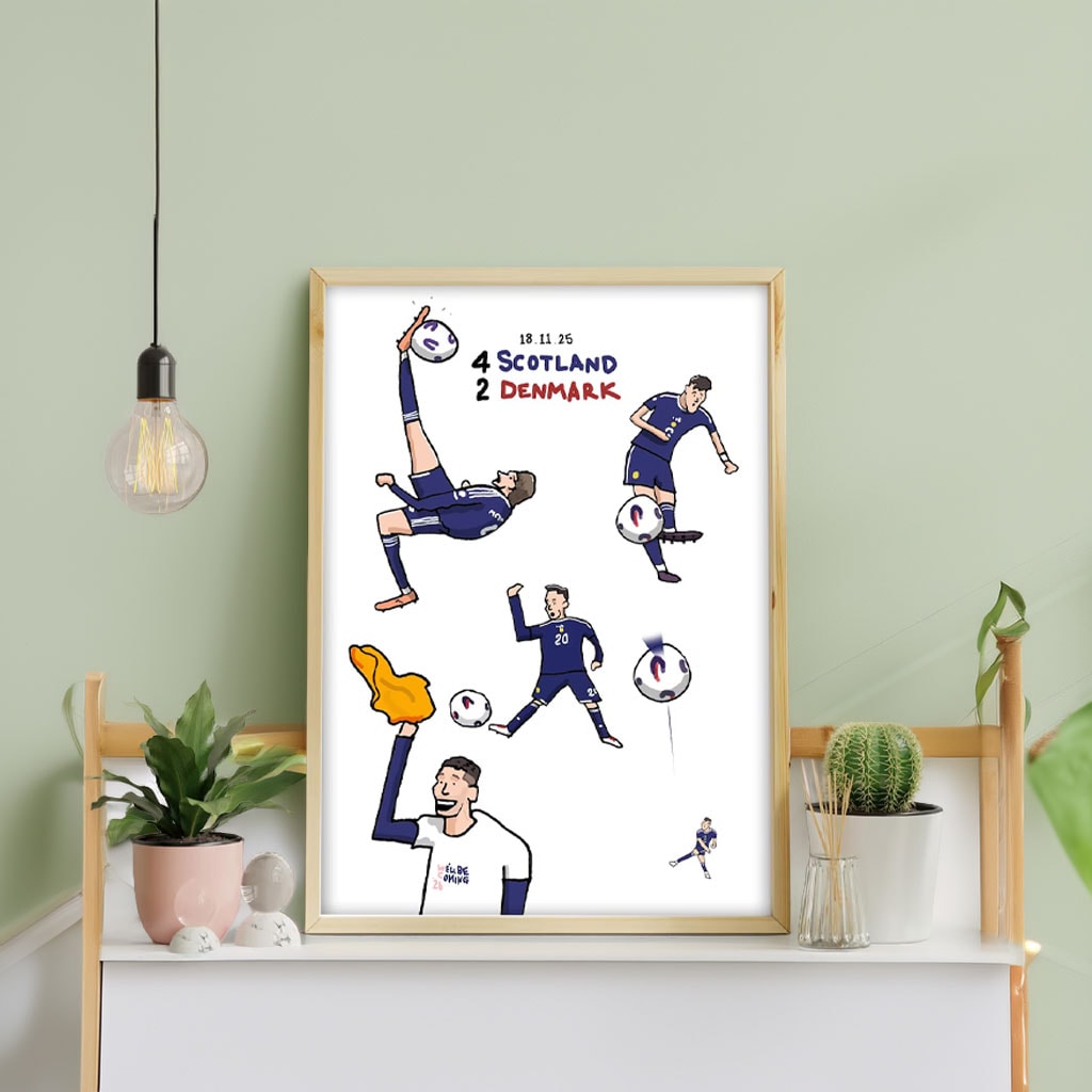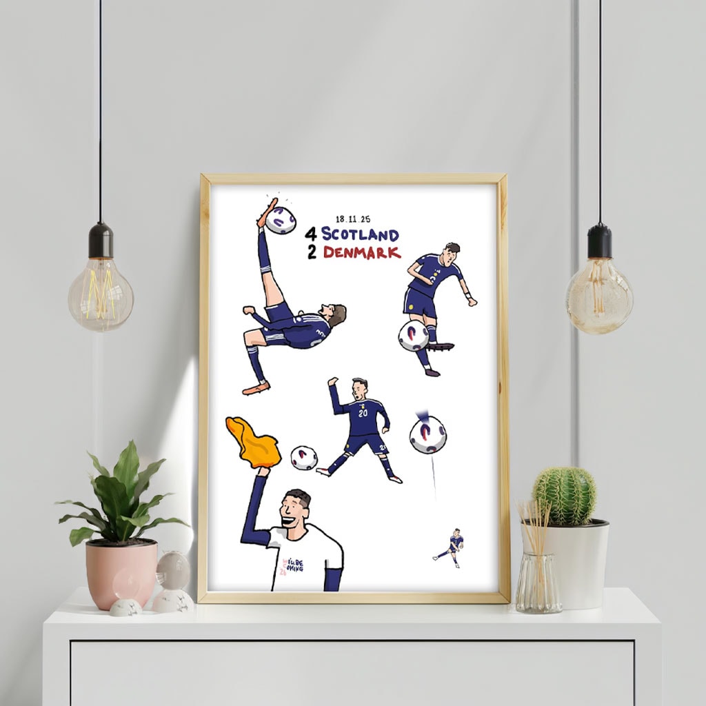 The 4–3 win over Denmark wasn’t just a match—it was a moment of national pride. This poster commemorates the passion and determination of Scotland’s squad and the roaring energy of the Tartan Army. Display it proudly as a reminder of everything the team fought for on their way to the World Cup.