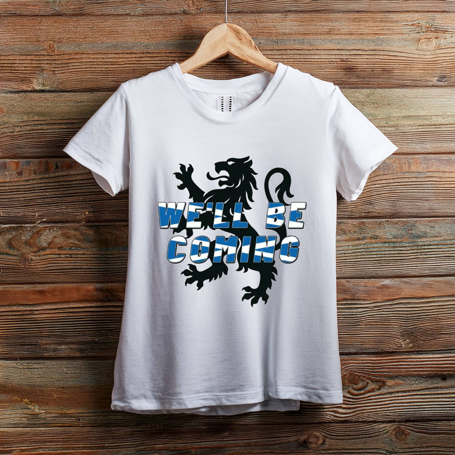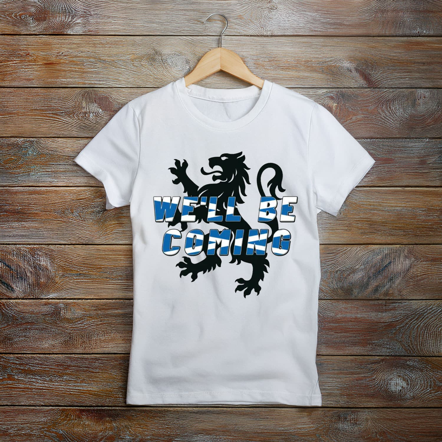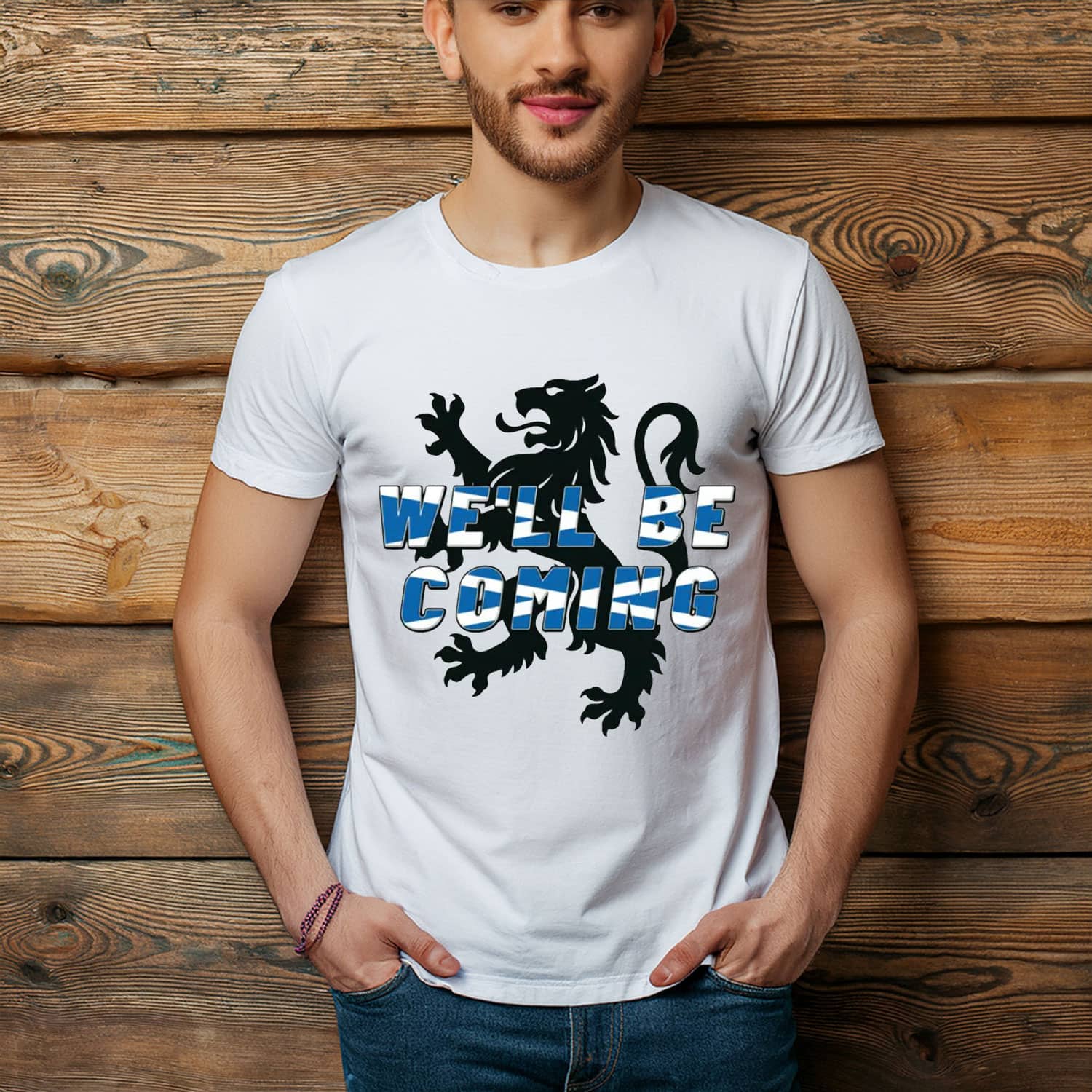 “We’ll Be Coming” is more than a chant—it’s Scotland’s anthem of unity and belief. This shirt showcases the phrase boldly, often paired with: