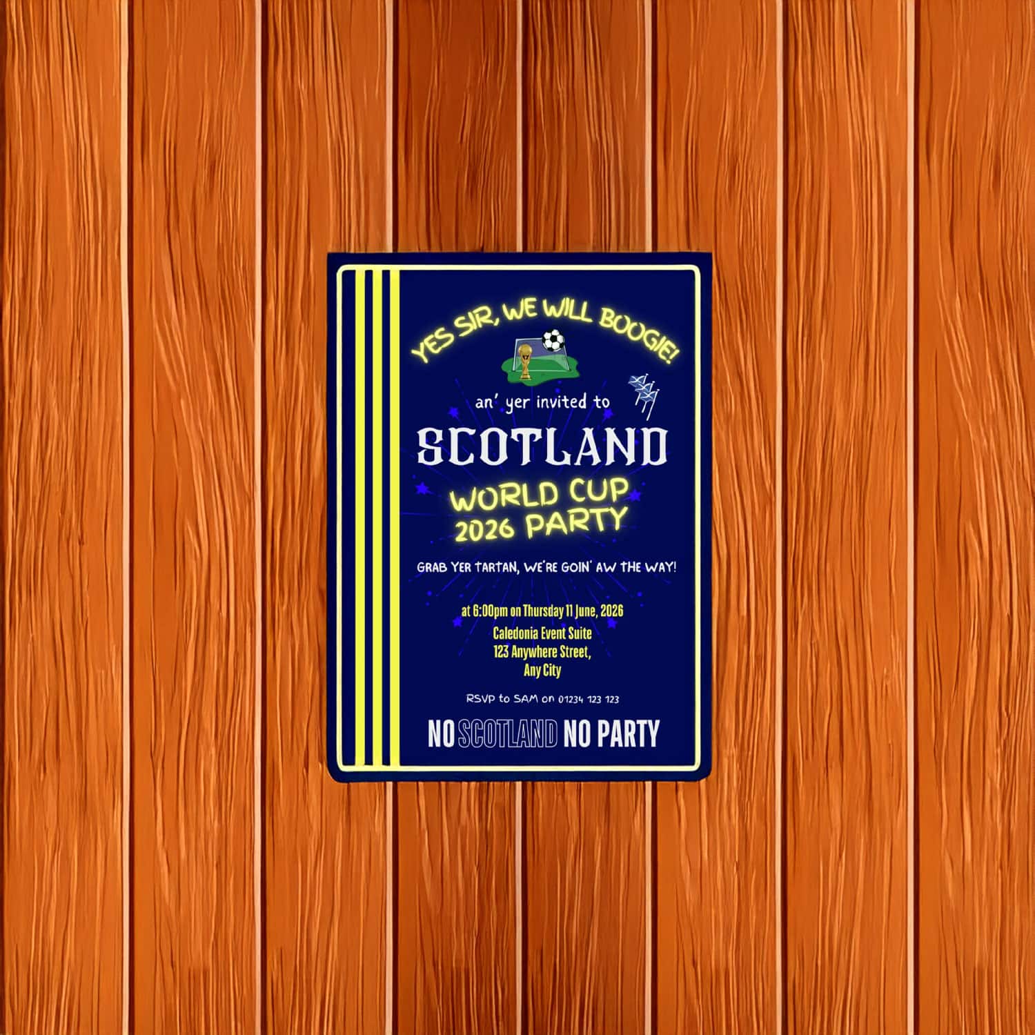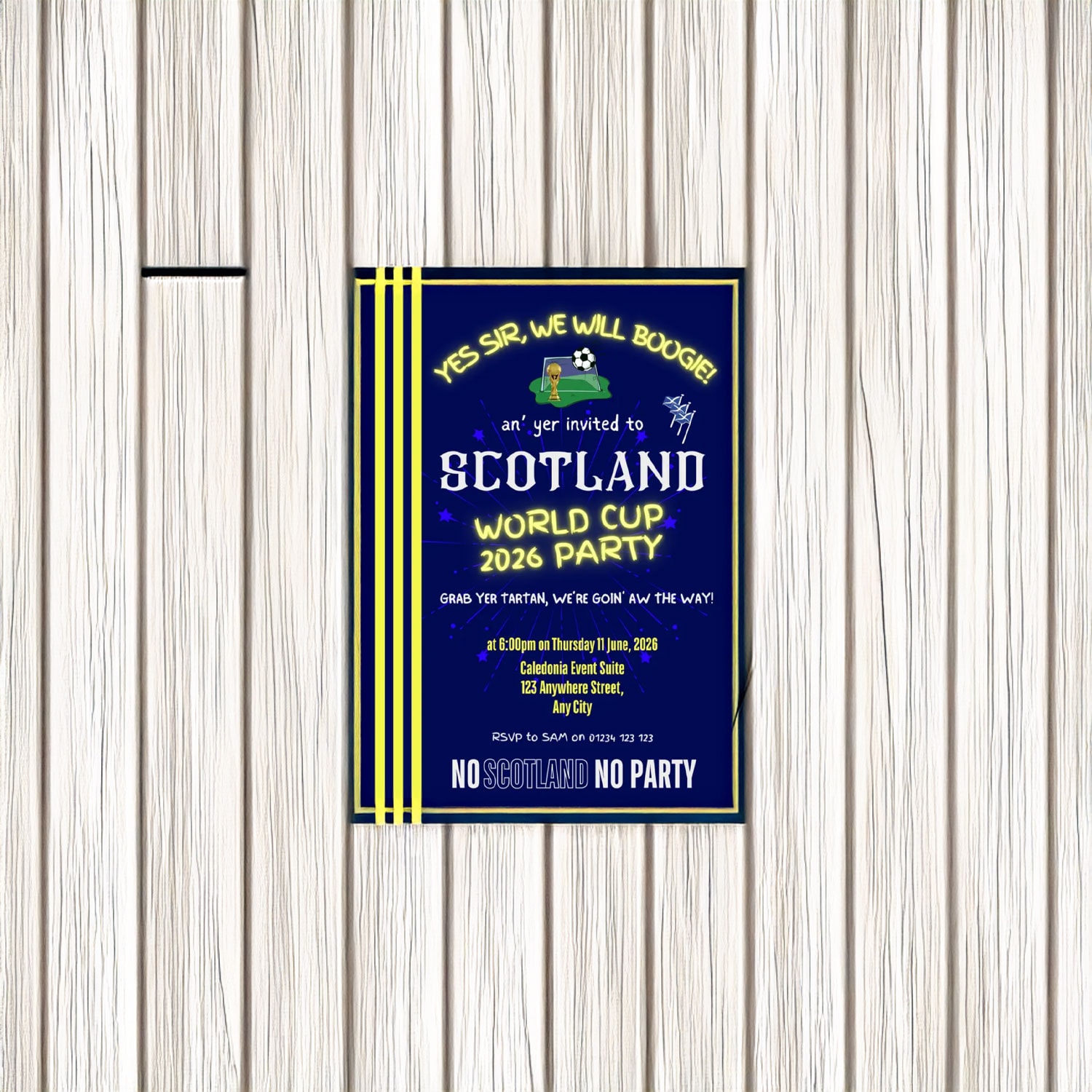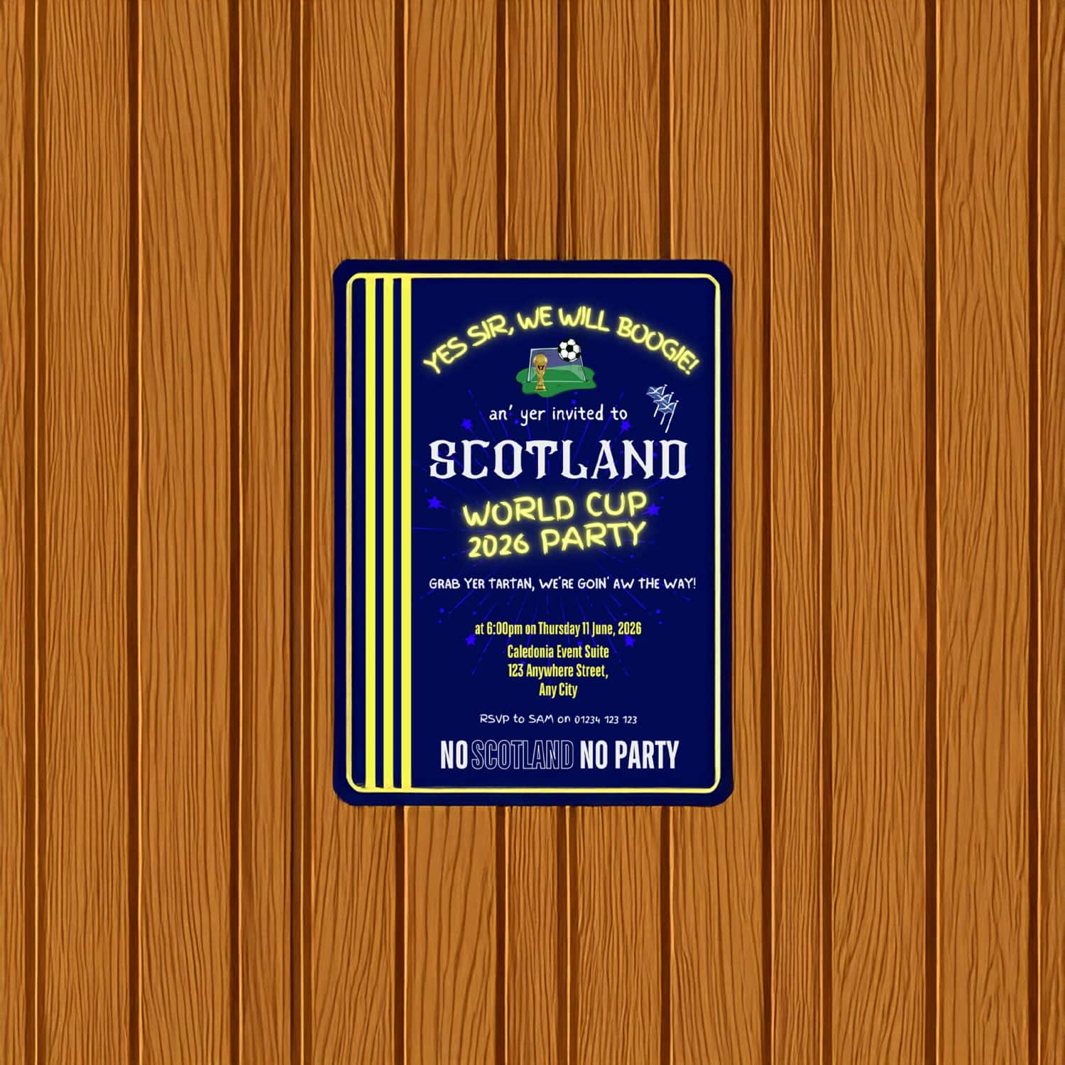 Bring the excitement of the 2026 World Cup straight into your home, pub, fan cave, or event space with the Scotland World Cup 2026 Editable Party Poster. Designed for Tartan Army supporters who want total creative control, this customizable poster lets you add names, dates, match details, party info, and more — all while keeping bold, energetic Scotland visuals.