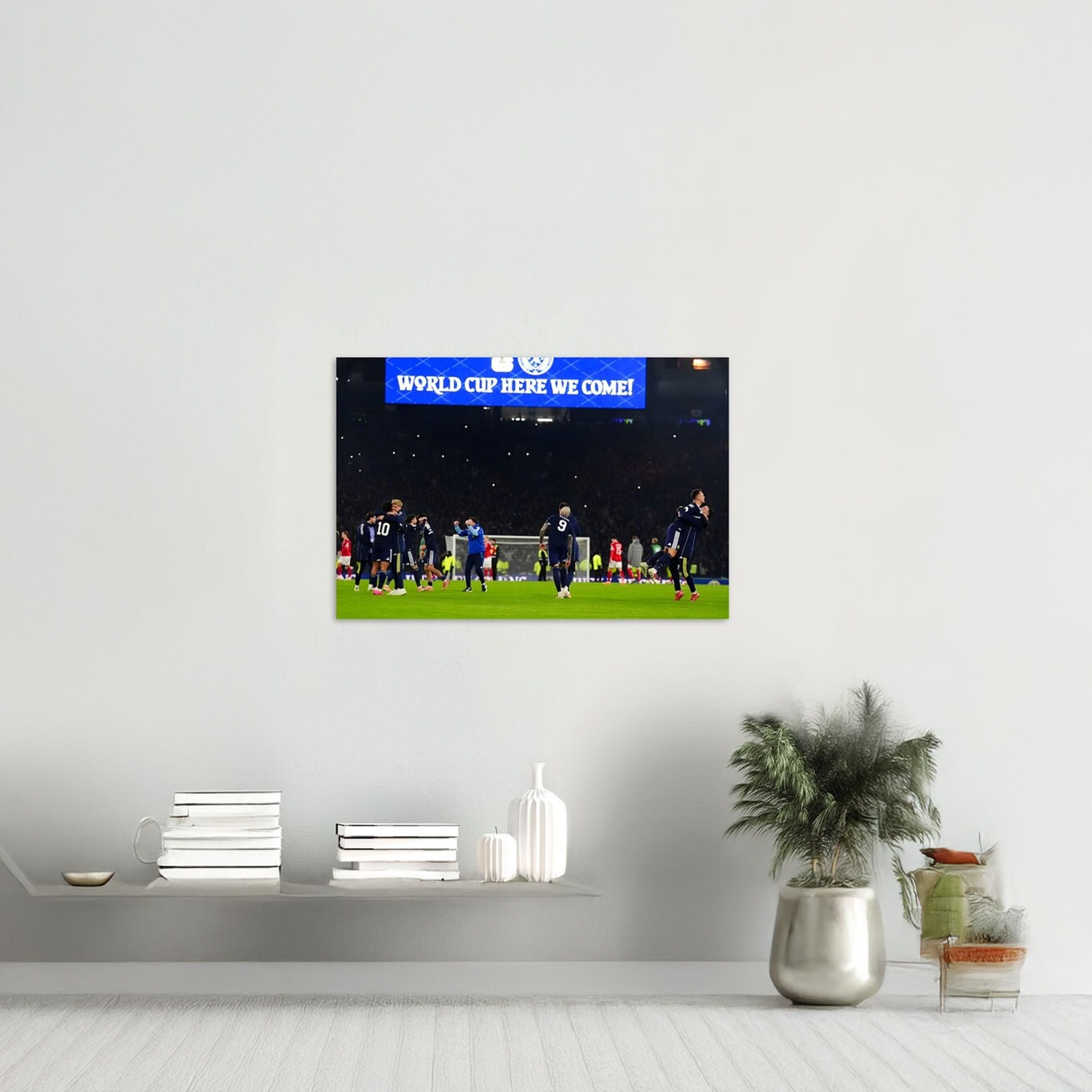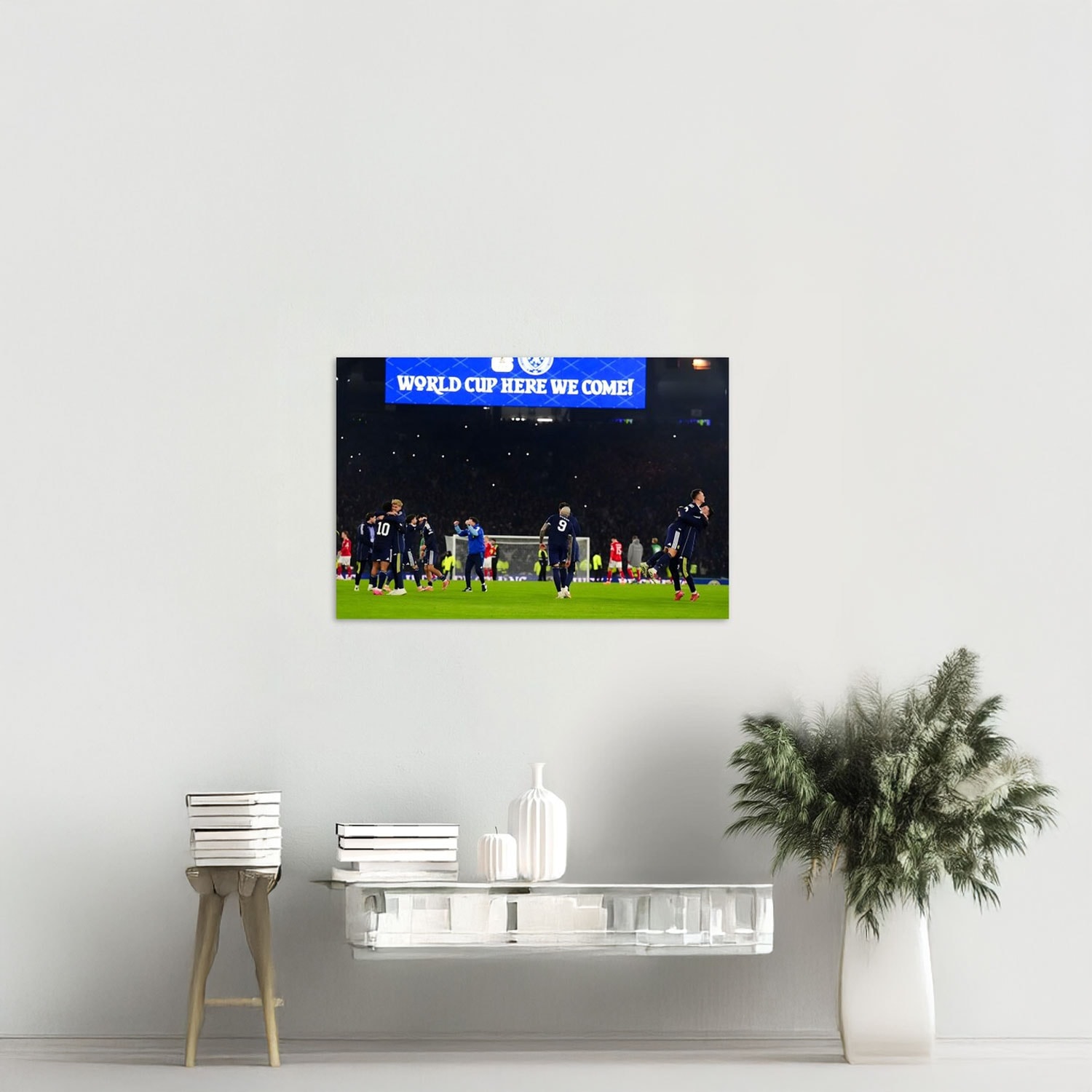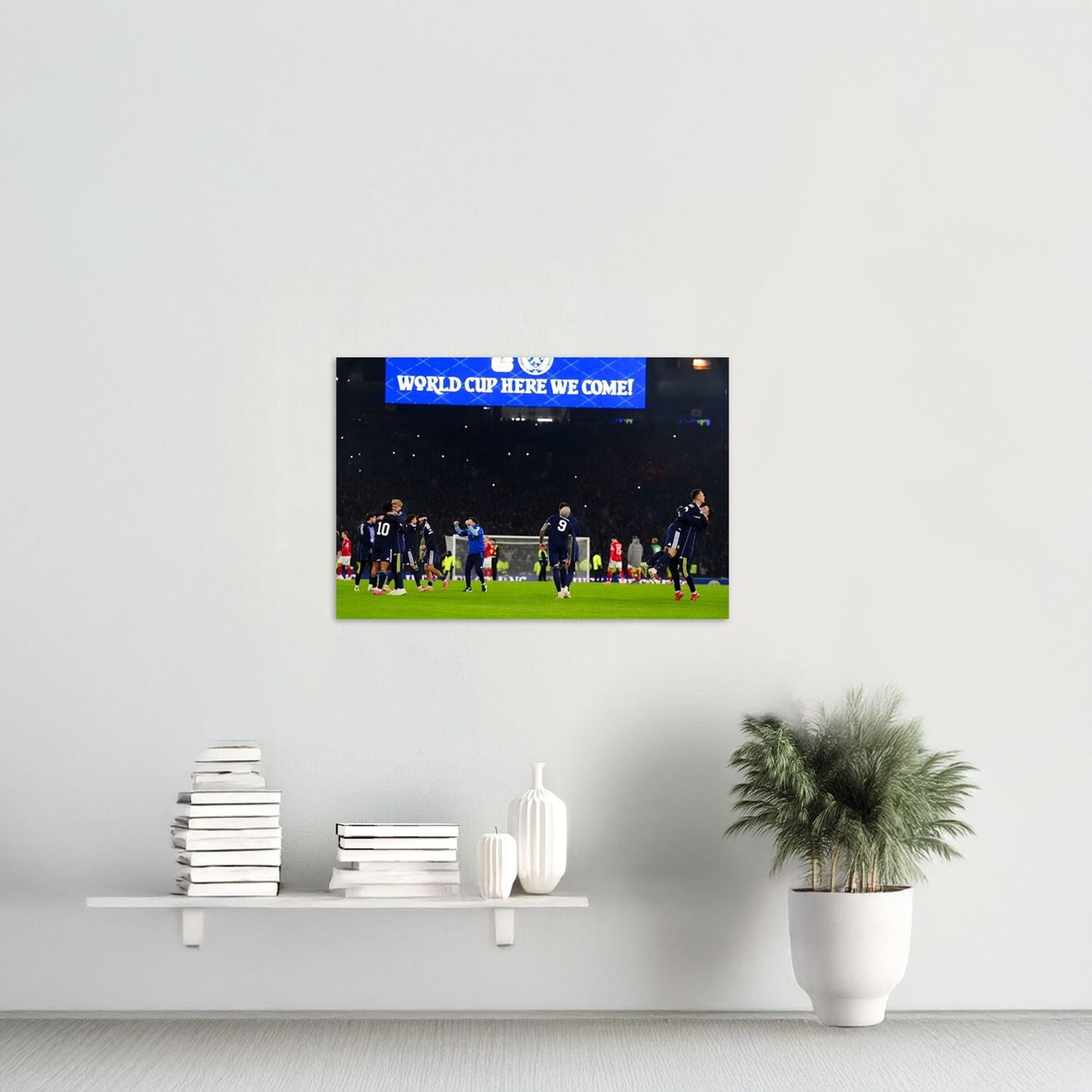 Featuring bold Scotland colors, dynamic action elements, and a triumphant “World Cup 2026 Glory” graphic, this poster embodies the heart and spirit of the Tartan Army. Whether it showcases players lifting their arms in victory, the flag waving behind them, or stylized celebration scenes, this artwork turns Scotland’s proudest moment into a lasting visual story.