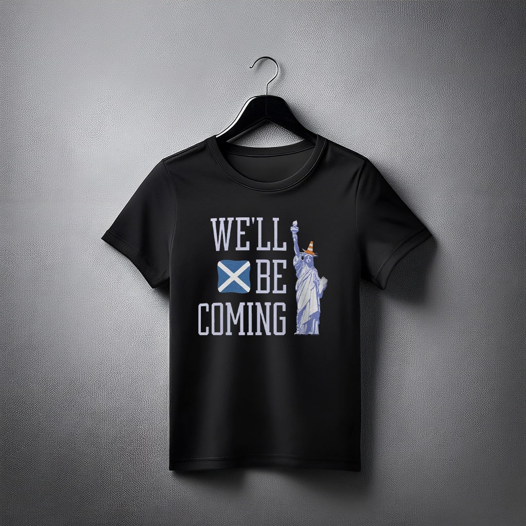 Crafted from soft, breathable fabric, this shirt keeps you comfortable whether you’re watching from the stands, joining the crowd at the pub, or cheering from home. The bold Scotland-themed artwork and the legendary “We’ll Be Coming” slogan make it a standout piece for any Tartan Army loyalist.
