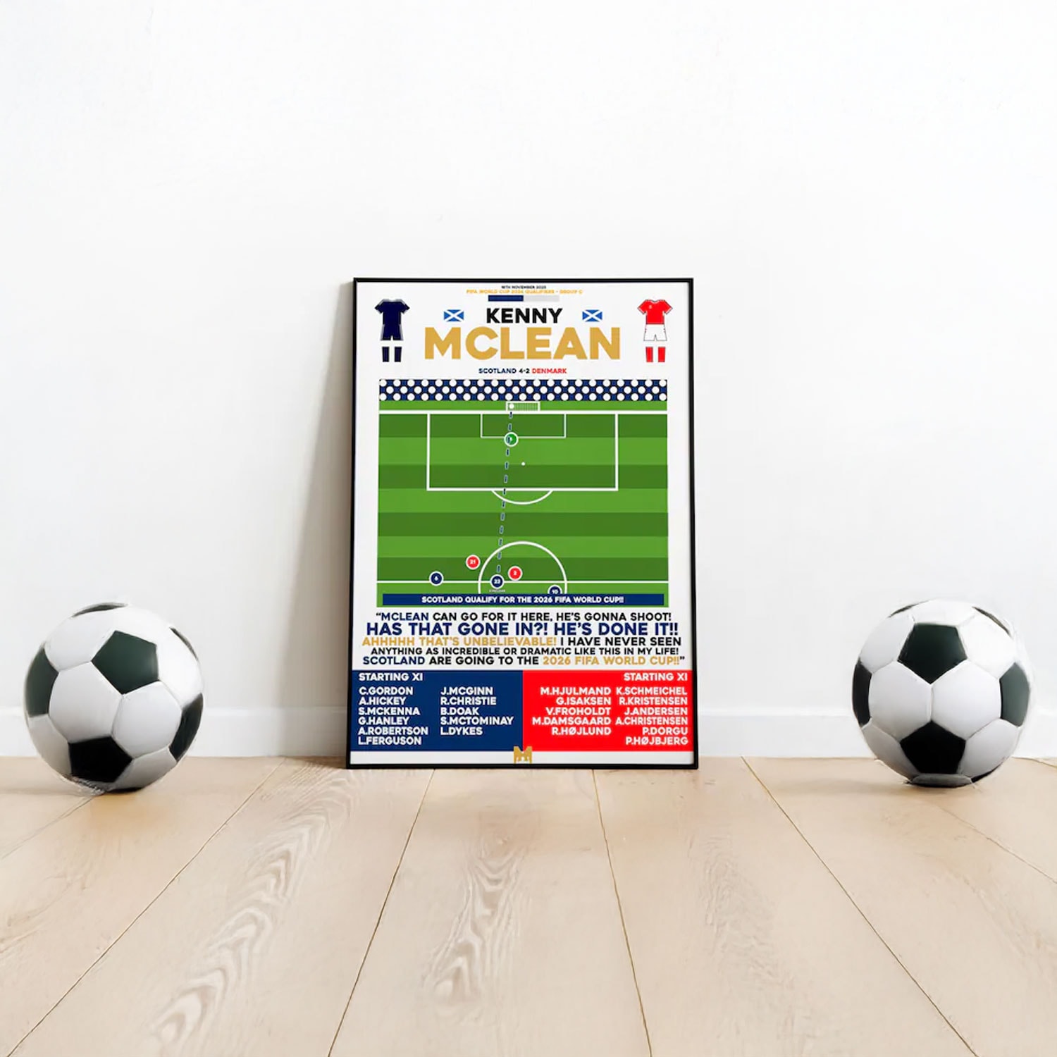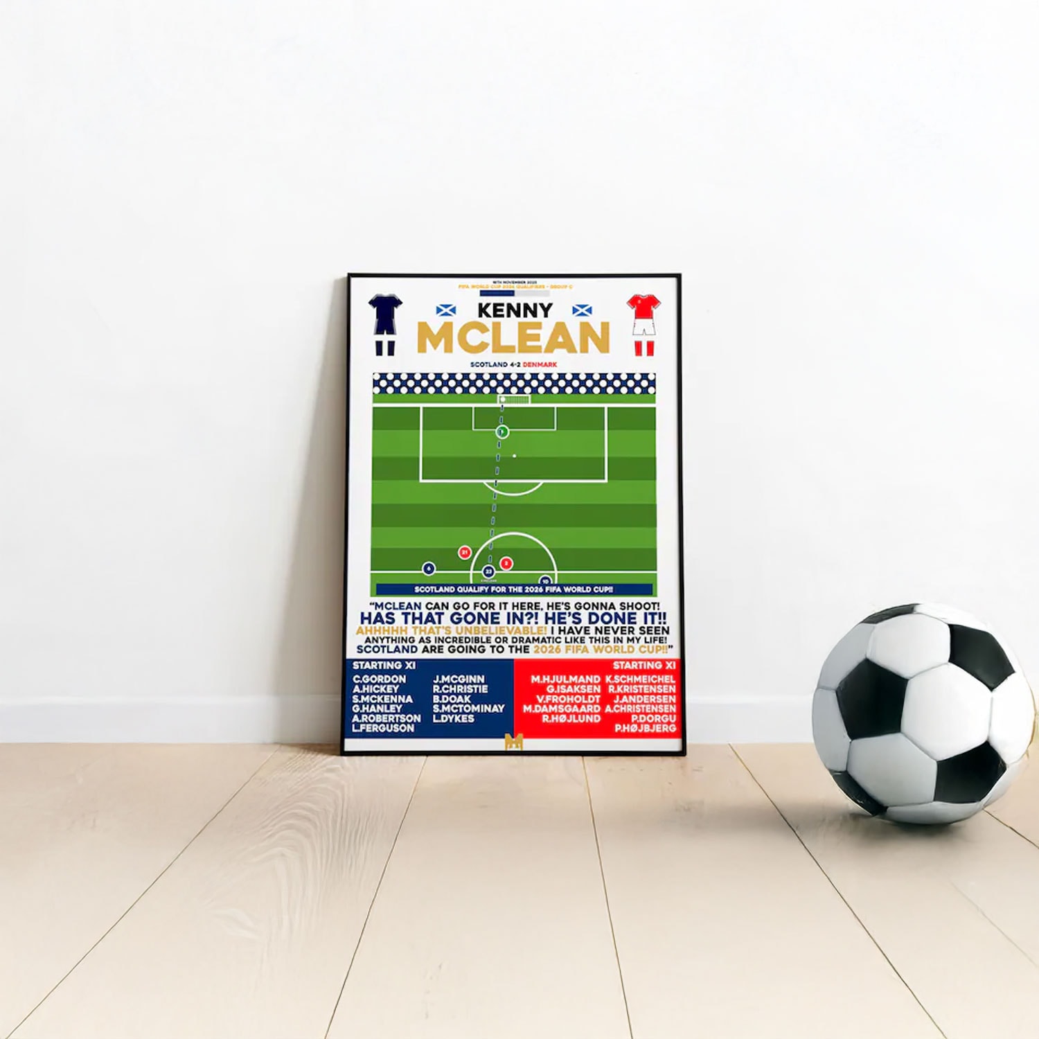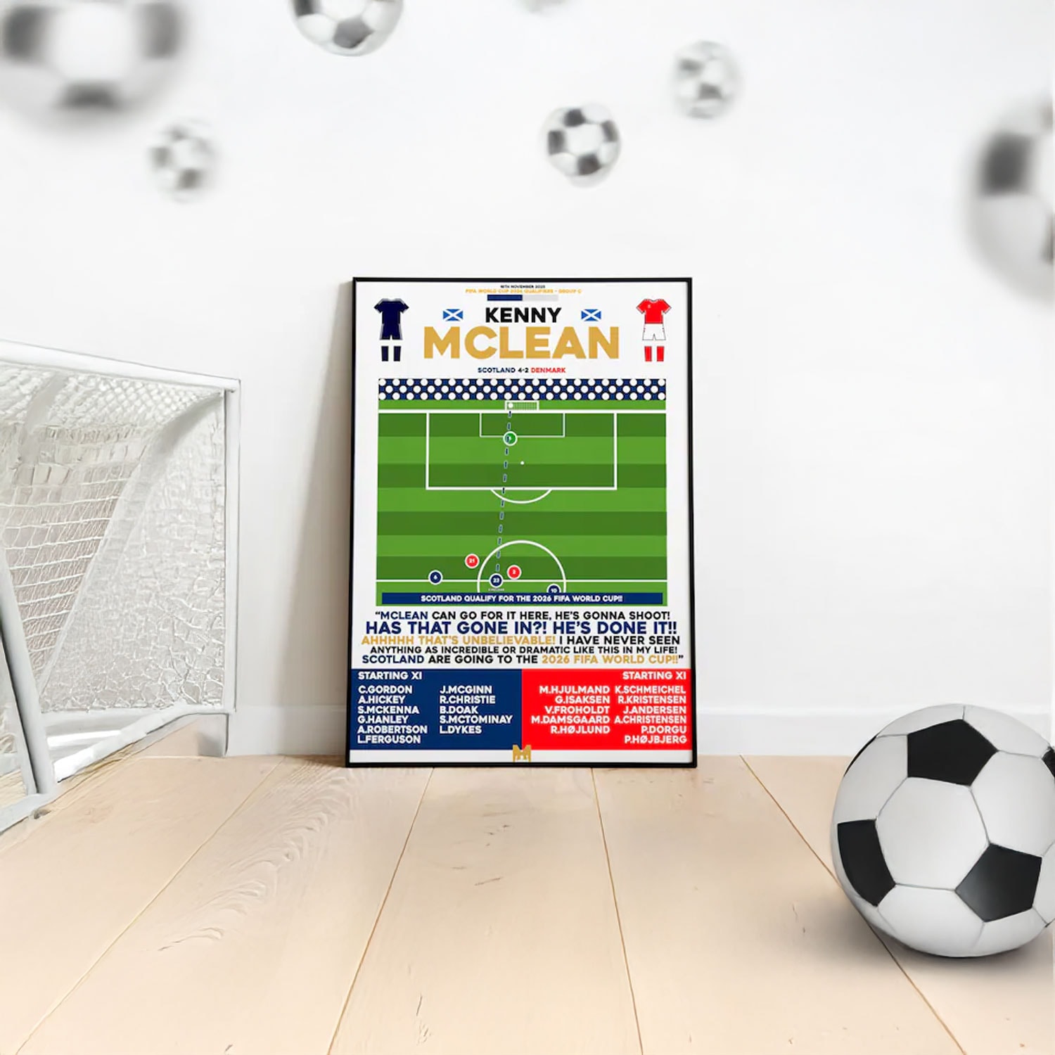 Featuring a dynamic illustration of McLean in action, complete with Scotland colors, dramatic match details, and bold graphic styling, this poster honors the moment Scotland fans will talk about for years — the moment McLean stepped up when it mattered most.